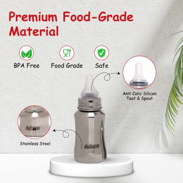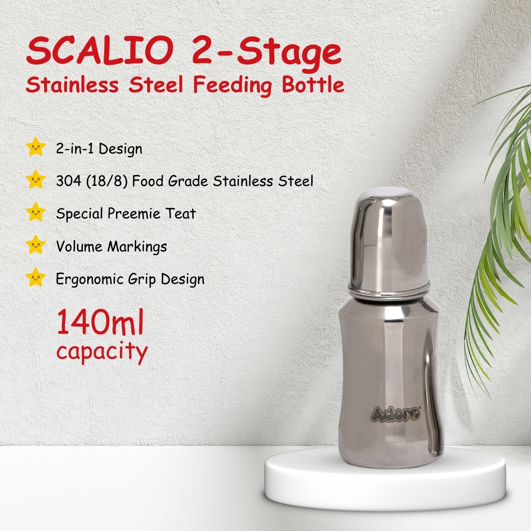 Adore Baby PRO SCALIO 2 stage Stainless Steel Feeding bottles are manufactured from 304 (18/8) Food Grade Stainless Steel, the ergonomic design perfectly compliments the bottle by firmly enhancing the grip. It is also equipped with a premium food grade Anti colic Silicon teat and Spout that has been manufactured using world class, state of the art machinery. The Flexi Soft Silicon teat acts as Feeding Bottle. In the Next stage, replace the teat with Flexi soft silicon spout to use as a Spout Sipper.