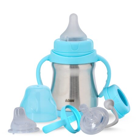 Adore® Stellar! Stainless Steel, 3 Stage Feeding bottles are manufactured from 304 (18/8) SS Food Grade Material with a Food Grade Silicon Teat, Spout, and Gravity Ball Straw.